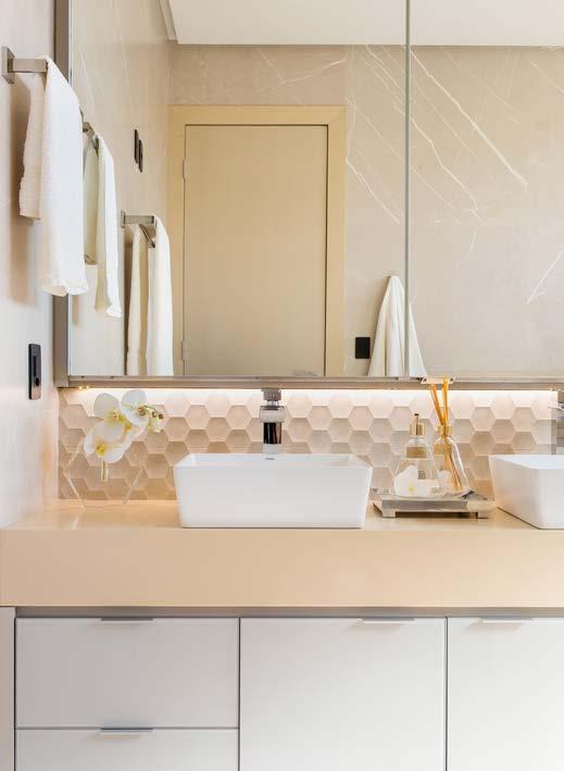 A bancada em quartzo bege abriga duas cubas modelo Trapezoidal de sobrepor, que não são apenas práticas, mas de grande efeito estético. Os nichos embutidos, igualmente em quartzo, foram posicionados de forma estratégica para otimizar o armazenamento, mantendo a organização e a fluidez do ambiente, além