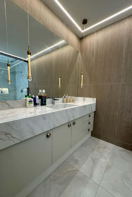 com spots sobre os armários e perfil de led para iluminar as superfícies de trabalho. Sobre a mesa de jantar foi colocado um pendente decorativo, com o objetivo de dar um toque contemporâneo ao conjunto. A mesma estratégia foi usada no banheiro do casal, por meio da escolha de pendentes bem modernos. Na suíte do casal foi utilizado um piso vinílico, sendo que o ponto alto do ambiente coube à cabeceira com papel de parede e às laterais em painel amadeirado Noce Califórnia ripado – que harmoniza com o armário em MDF Pérola Urbana. O piso do banheiro da suíte recebeu o Munari branco 90x90 cm. Na parede, optou-se pelo Iluminato bege, no mesmo formato do piso, e na bancada, o Quarela Canaletto. Tons mais escuros foram escolhidos para o espaço home office, com o papel de parede aplicado em uma das paredes e também no teto. Para o piso e a parede do banheiro a opção foi o porcelanato York SGR 88x88 cm, que contrasta com o Metro Black 10x20 cm e com a bancada São Gabriel.