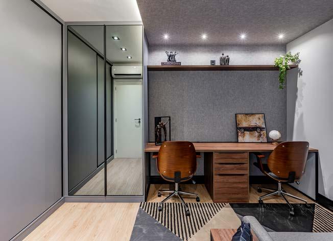 com spots sobre os armários e perfil de led para iluminar as superfícies de trabalho. Sobre a mesa de jantar foi colocado um pendente decorativo, com o objetivo de dar um toque contemporâneo ao conjunto. A mesma estratégia foi usada no banheiro do casal, por meio da escolha de pendentes bem modernos. Na suíte do casal foi utilizado um piso vinílico, sendo que o ponto alto do ambiente coube à cabeceira com papel de parede e às laterais em painel amadeirado Noce Califórnia ripado – que harmoniza com o armário em MDF Pérola Urbana. O piso do banheiro da suíte recebeu o Munari branco 90x90 cm. Na parede, optou-se pelo Iluminato bege, no mesmo formato do piso, e na bancada, o Quarela Canaletto. Tons mais escuros foram escolhidos para o espaço home office, com o papel de parede aplicado em uma das paredes e também no teto. Para o piso e a parede do banheiro a opção foi o porcelanato York SGR 88x88 cm, que contrasta com o Metro Black 10x20 cm e com a bancada São Gabriel.