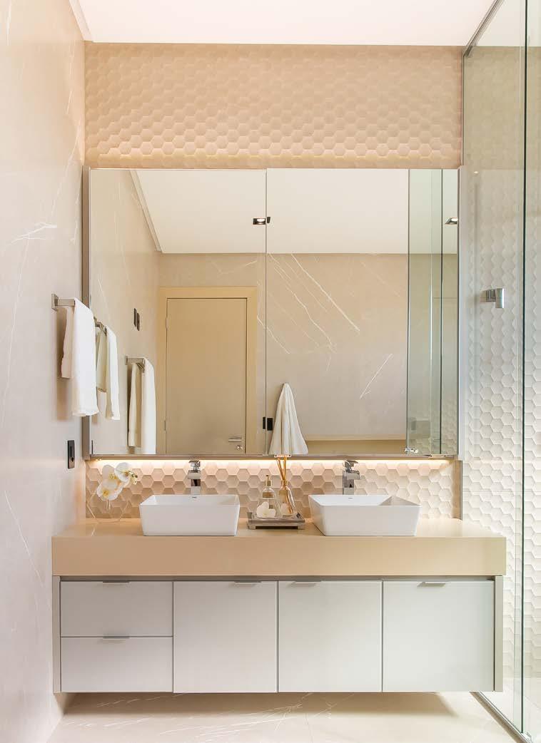 O uso estratégico de materiais e texturas proporciona uma integração entre os elementos, transmitindo elegância e o bom gosto em cada detalhe. O porcelanato Pulpis bege 100x100 cm, utilizado no piso e nas paredes, dialoga perfeitamente com o revestimento texturizado porcelanato Level Living Wall Biscuit 30x90 cm, que se destaca na parede da bancada e do box, criando uma composição visual harmônica e, ao mesmo tempo, atemporal.