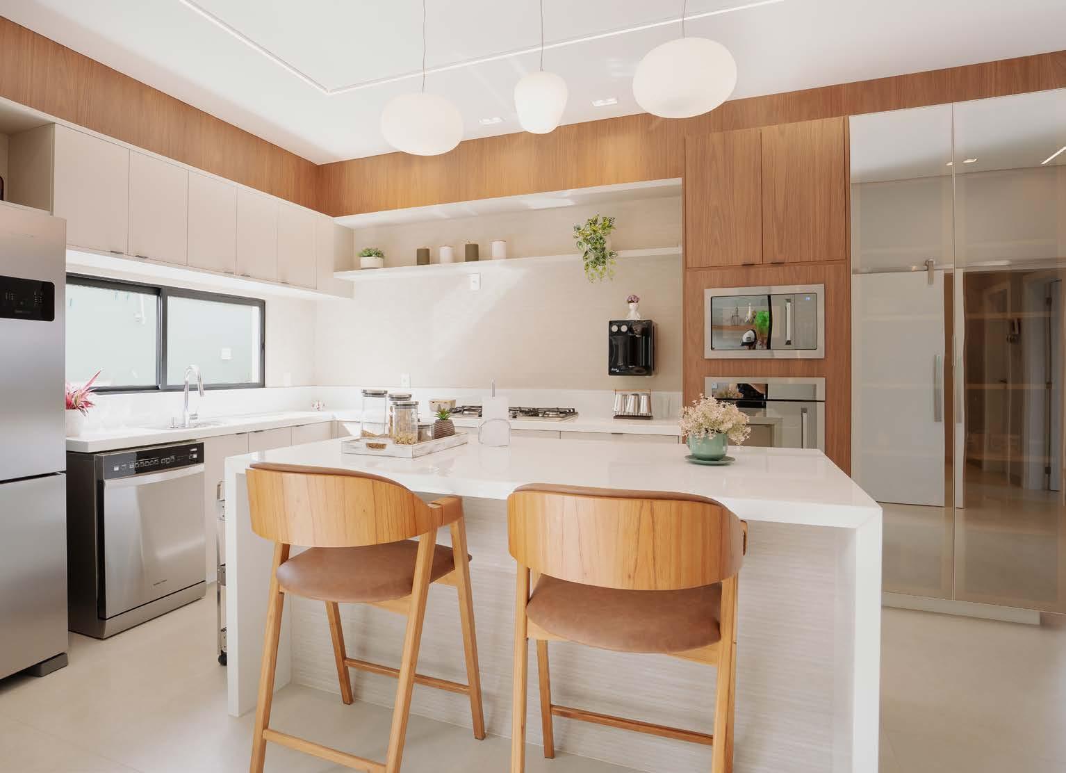 Os armários planejados em tom fendi harmonizam com a bancada no mesmo material da ilha. Os eletrodomésticos de embutir — forno, micro-ondas e cooktop na ilha — completam o conjunto com tecnologia e estética refinada. Um destaque
