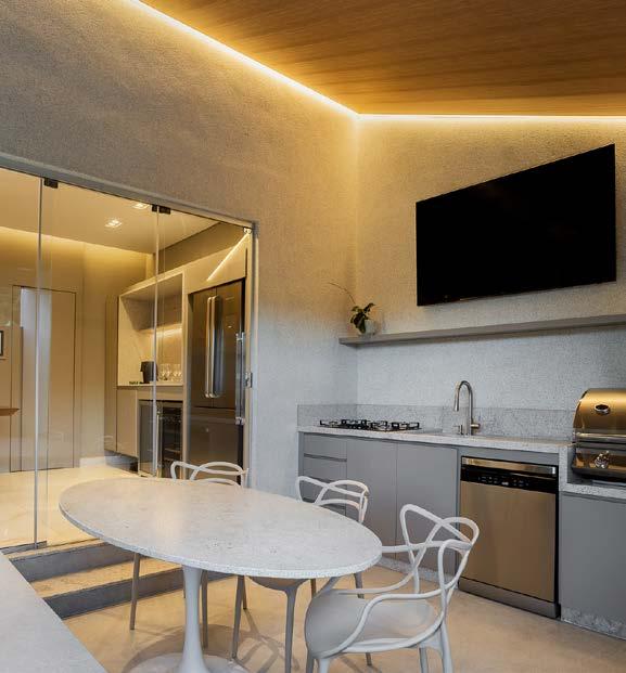 Granito Preta São Gabriel e o Silestone Calacatta Gold aparecem nas bancadas de forma contrastante, conferindo modernidade e imponência ao espaço. O revestimento definido para a parede da churrasqueira, Roca Sahara 120x120 cm, dá continuidade ao tom mais escuro. Um dos destaques da cozinha é o pórtico no mesmo MDF com iluminação de LED que abrange toda a sua parte funcional, criando uma unidade visual. A iluminação cria pontos de destaque e transforma a atmosfera em um convite a bons momentos.