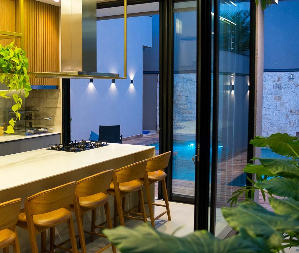 A integração entre os ambientes internos e externos e a conexão com a natureza por meio do jardim de inverno e da área externa da piscina reforçam a sensação de bem-estar e acolhimento.