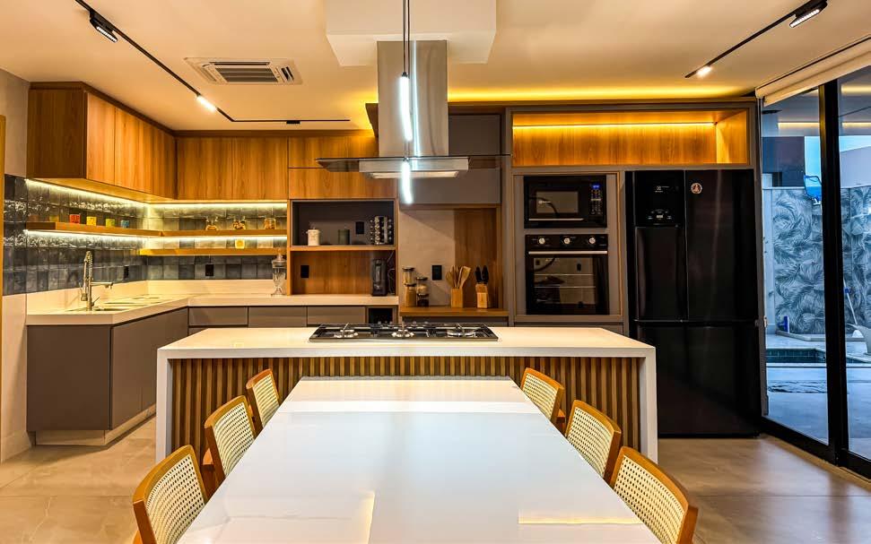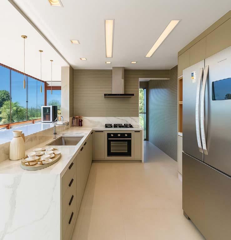Os armários planejados em tom fendi harmonizam com a bancada no mesmo material da ilha. Os eletrodomésticos de embutir — forno, micro-ondas e cooktop na ilha — completam o conjunto com tecnologia e estética refinada. Um destaque