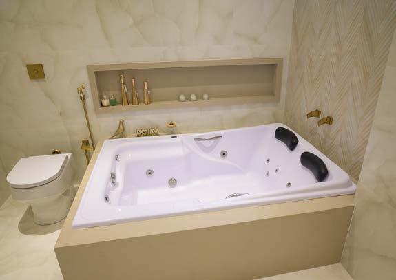 branco, banheira de hidromassagem e metais dourados. No piso e nas paredes foi usado o Gran Castello de Boullon Lux Polido 62x121 cm. Já o Durham Marmo criou uma textura diferenciada no fundo da banheira. Ainda nesse andar destaca-se o charmoso banheiro social, com revestimento Amazonita Polido 80x140 cm, combinado ao Athea 120x120 cm, ao metal de cobre escovado e à bancada em tons de azul e bege. No segundo piso também há integração entre sala e cozinha, dentro de um estilo mais arrojado, pensado para traduzir a personalidade do jovem casal. As bancadas sobressaem nesta composição: