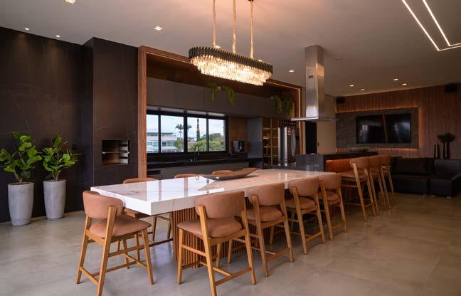 Granito Preta São Gabriel e o Silestone Calacatta Gold aparecem nas bancadas de forma contrastante, conferindo modernidade e imponência ao espaço. O revestimento definido para a parede da churrasqueira, Roca Sahara 120x120 cm, dá continuidade ao tom mais escuro. Um dos destaques da cozinha é o pórtico no mesmo MDF com iluminação de LED que abrange toda a sua parte funcional, criando uma unidade visual. A iluminação cria pontos de destaque e transforma a atmosfera em um convite a bons momentos.