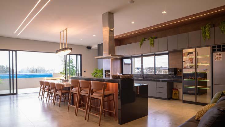 a alta, em Silestone Branco, foi projetada para refeições rápidas e momentos descontraídos, enquanto a parte funcional da cozinha recebeu o prático Silestone Cinza. Na marcenaria da sala foram usados os mesmos tons da cozinha (Noce Naturale e Nude Vel) e o painel da TV tem MDF Amana com perfil de LED. A parede foi revestida com o Savoy Silver Polido 80x140 cm, que gera imponência e sofisticação, mas sem excessos. A iluminação foi essencial para evidenciar cada detalhe da marcenaria, das texturas e dos materiais, enquanto a escada trabalhada em Silestone permite o acesso à área gourmet, tornando-se mais um ponto de destaque na casa.