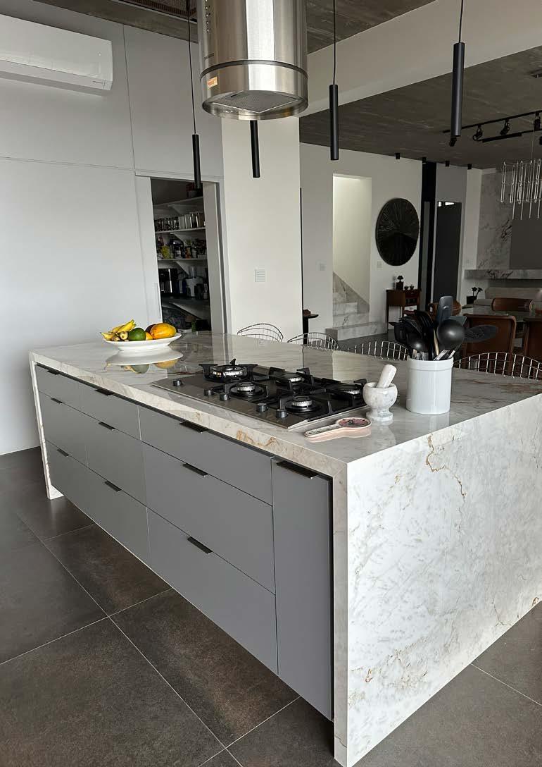 A escolha dos materiais traduz a essência contemporânea do espaço, com uma base neutra e elegante que destaca o calor da madeira e o brilho natural do sol refletido nos materiais. A bancada em Statuario Extra, linha Classic, protagoniza a composição, unindo estética e funcionalidade, realizando o desejo da cliente de ter uma bancada marmorizada. Além disso, ela