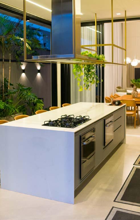 A integração entre os ambientes internos e externos e a conexão com a natureza por meio do jardim de inverno e da área externa da piscina reforçam a sensação de bem-estar e acolhimento.
