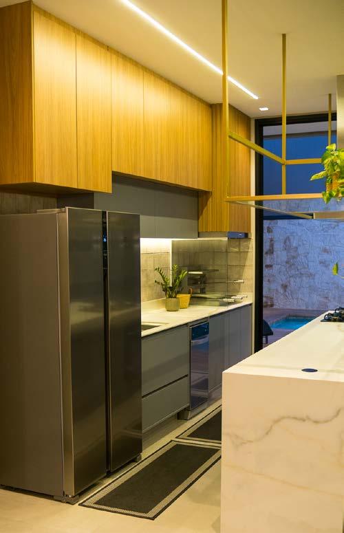 Para o piso selecionou-se o York SGR 87x87 cm, e para a parede acima da pia, o Olaria Gris 15x15 cm. A bancada central recebeu o Onice Bianco. O mármore traz elegância e a madeira aquece, enquanto o verde das plantas complementa a composição, reforçando o equilíbrio entre o industrial e o natural. A marcenaria em MDF Itapuã e os elementos metálicos em dourado ampliam a percepção de refinamento, ao mesmo tempo que a iluminação estratégica suaviza o conjunto, garantindo equilíbrio e frescor visual. Planejada para ser indireta, a iluminação usa peças minimalistas, como perfis de LED e poucos spots embutidos no forro, permitindo que o ponto de atenção caiba aos demais elementos do projeto.