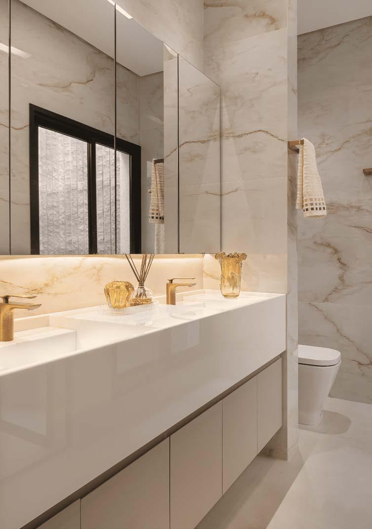 O banheiro central foi todo revestido com o Galleria Onix Bianco 120x120 cm, enquanto no banheiro social aplicou-se o Galleria Statuario Superior 120x120 cm no piso e nas paredes. Para o box, a escolha foi o Chloe Lux 120x120 cm. O projeto de iluminação da residência valorizou a luz natural e luz quente por meio de pendentes, luz direcionada e fitas de led.