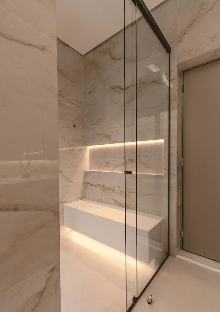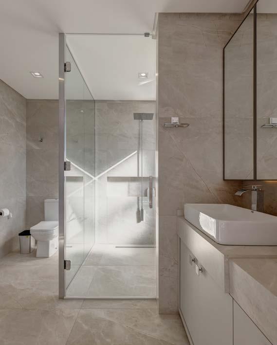 reito para ela. Para o banheiro da suíte foi eleito o porcelanato Onix Cristallo 59x118 cm, usado tanto no piso como nas paredes. No box utilizou-se o Plissado Natural 58x58 cm.