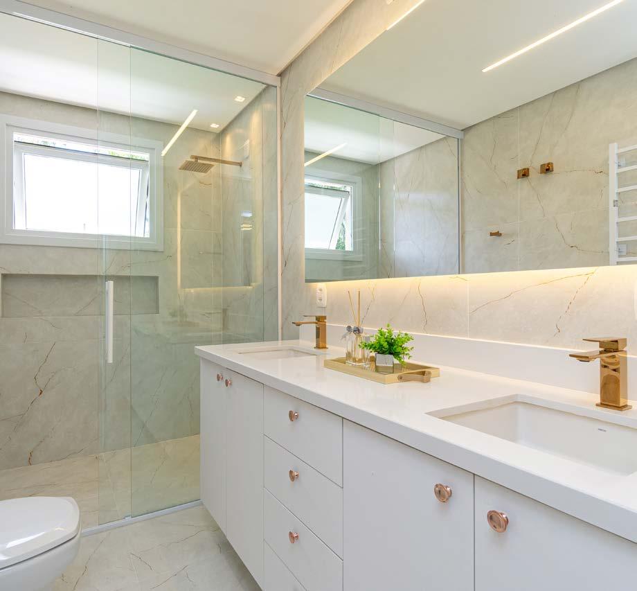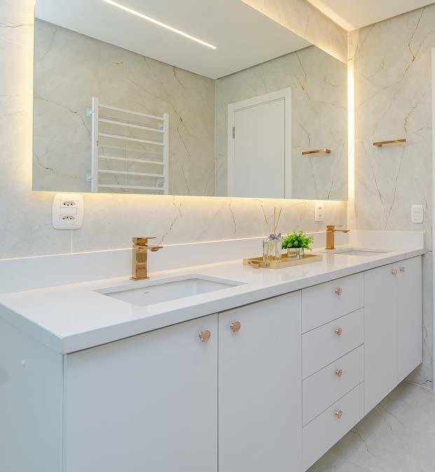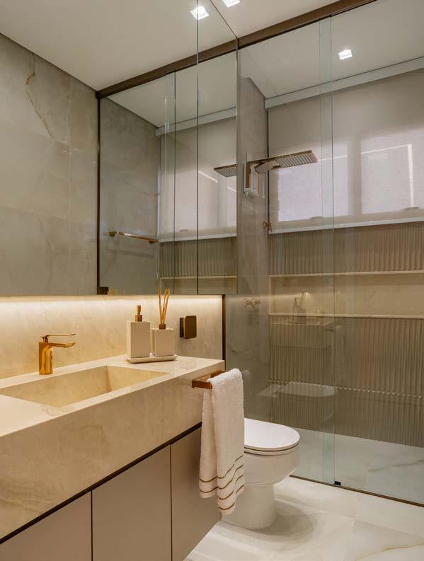 O grande destaque coube aos metais em Rosé Gold (os puxadores dos armários também são nesse acabamento), que criaram um efeito elegante sobre a base neutra, imprimindo personalidade ao espaço. O resultado é um banheiro acima de modismos, equilibrado e convidativo, onde cada detalhe foi idealizado para transmitir elegância, sem abrir mão da praticidade.