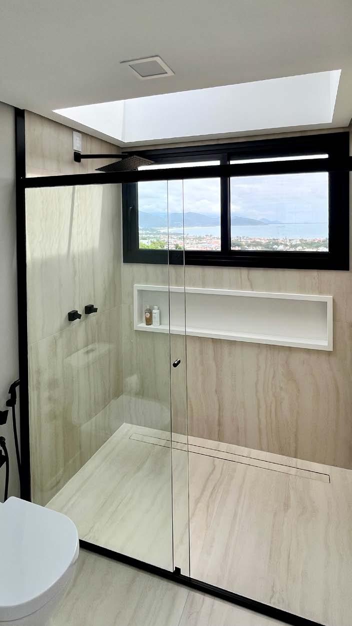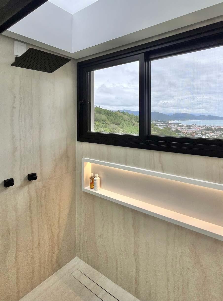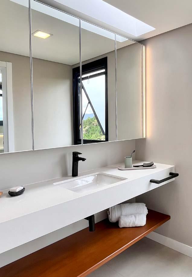As aberturas enquadram o verde do morro e a vista da Baía de Garopaba, no litoral catarinense, transformando o banho em uma cerimônia de integração com a natureza. Optou-se também pela não utilização de armários fechados na área inferior, preservando a ventilação e a leveza visual do espaço. A questão do armazenamento de produtos de higiene foi resolvida com um armário de portas de espelho sobre a bancada, garantindo organização sem comprometer a fluidez do ambiente.