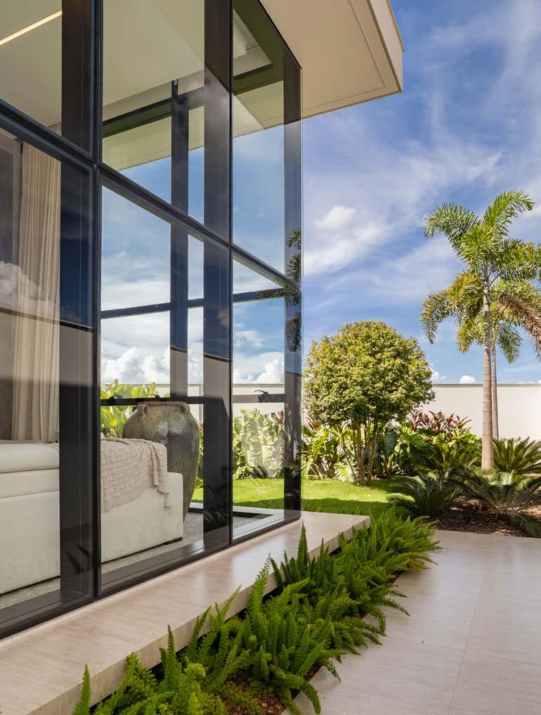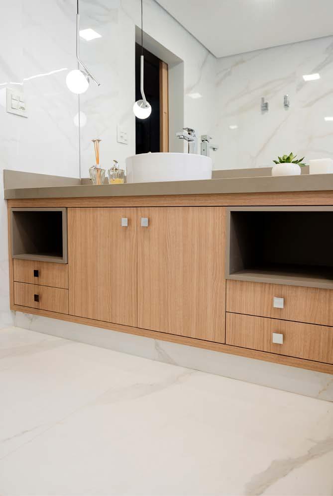 A ampla bancada com duas cubas assegura funcionalidade na rotina. As gavetas inferiores e o armário superior com portas espelhadas ampliam visualmente o espaço. A bacia sanitária foi posicionada de forma mais reservada, garantindo privacidade sem comprometer a fluidez do layout. O box generoso, com banco integrado, reforça a atmosfera de spa e estabelece conexão direta entre a área interna e o pátio externo por meio da esquadria em alumínio.