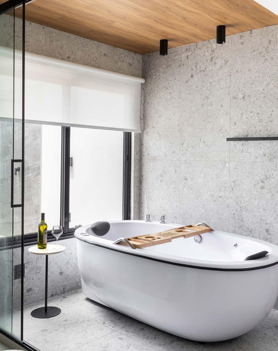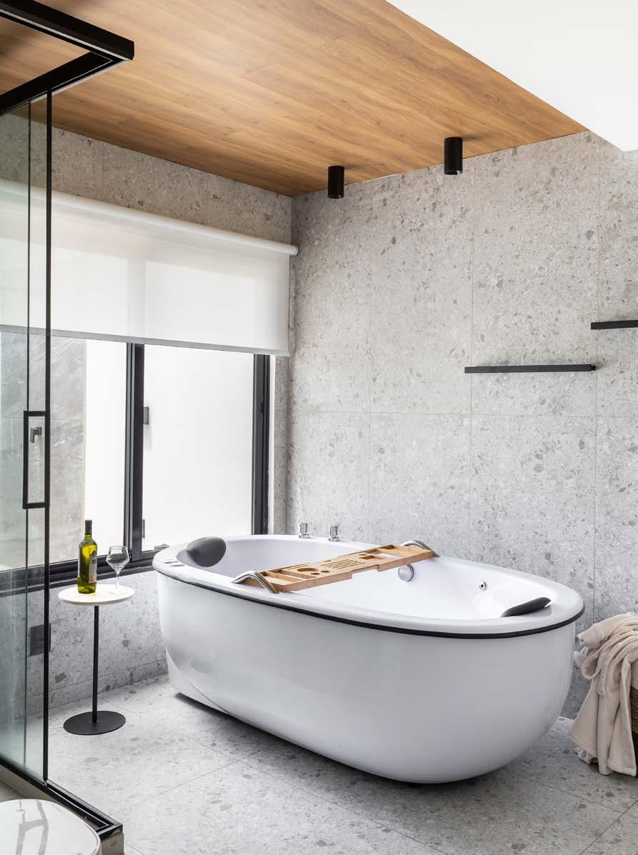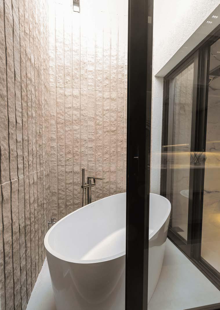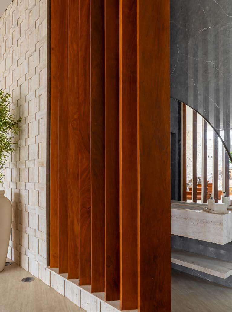 e exterior, transformando o banho em um ritual de contemplação. O pátio onde fica a banheira potencializa essa experiência, ao proporcionar iluminação zenital. Emoldurada pelo revestimento Pedra Traccia na cor Fendi, a abertura voltada para o norte garante insolação indireta, valorizando texturas e criando atmosferas que se transformam com a passagem do tempo.