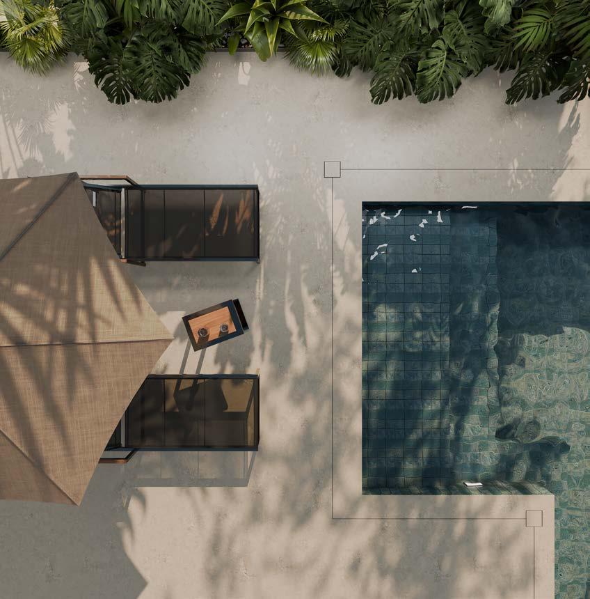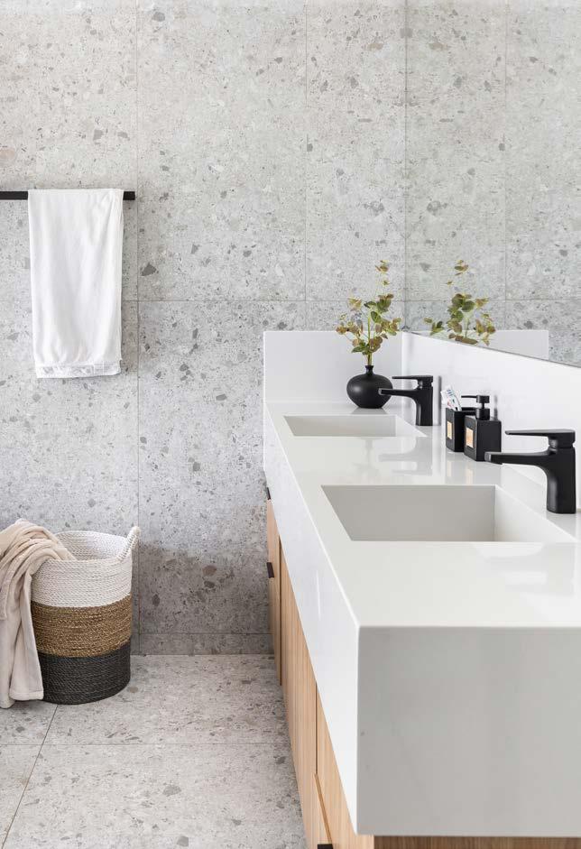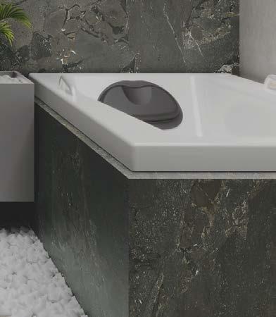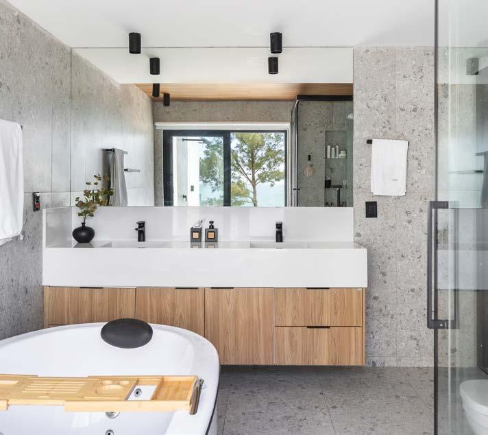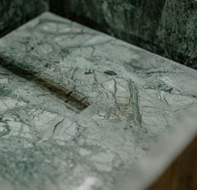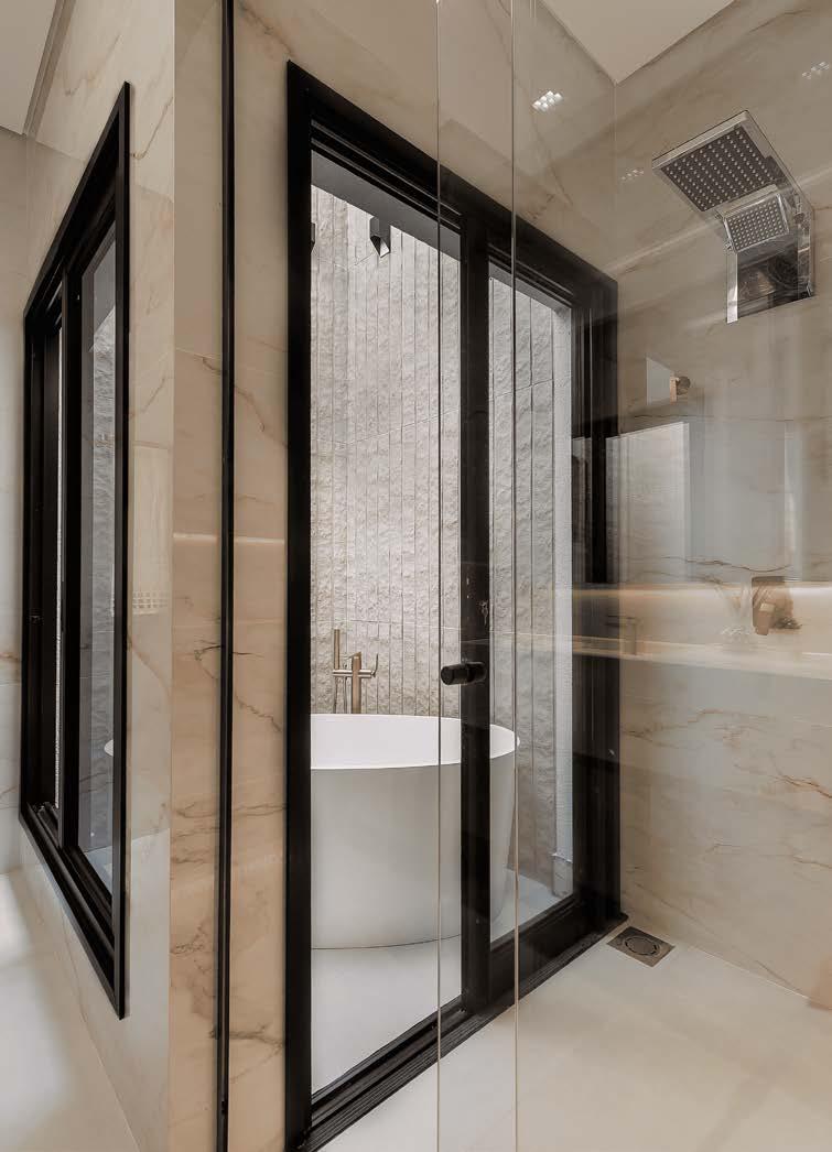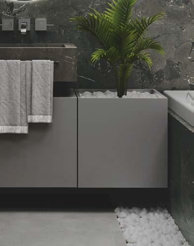 e exterior, transformando o banho em um ritual de contemplação. O pátio onde fica a banheira potencializa essa experiência, ao proporcionar iluminação zenital. Emoldurada pelo revestimento Pedra Traccia na cor Fendi, a abertura voltada para o norte garante insolação indireta, valorizando texturas e criando atmosferas que se transformam com a passagem do tempo.