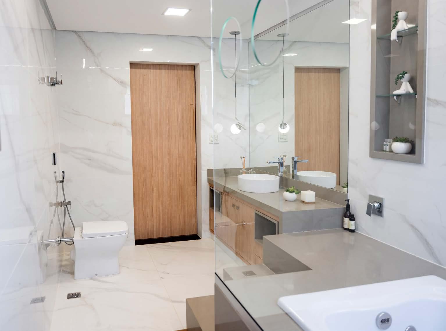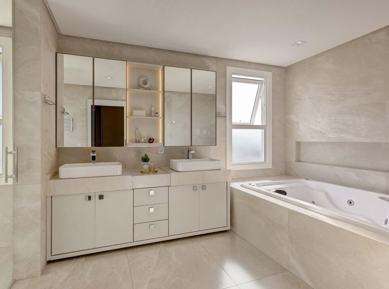O banheiro da suíte do casal foi planejado para ser um espaço clean, valorizando sua amplitude. A escolha decorativa foi usar o mesmo porcelanato Monte Bianco acetinado 82 x 141 cm no piso, nas paredes, no nicho e também na bancada da pia. Cubas duplas retangulares foram colocadas sobre a bancada, toda esculpida no porcelanato. Ao usar o Monte Bianco em todo o banheiro, as profissionais obtiveram um visual sem emendas, mantendo a uniformidade e a leveza estética.