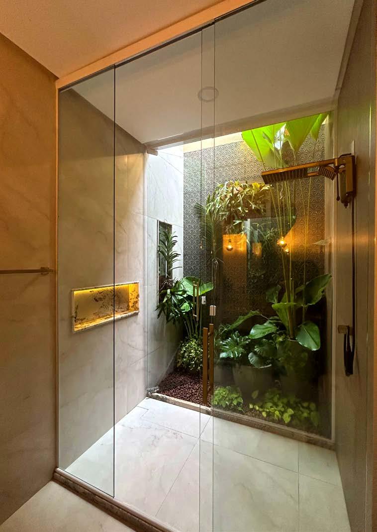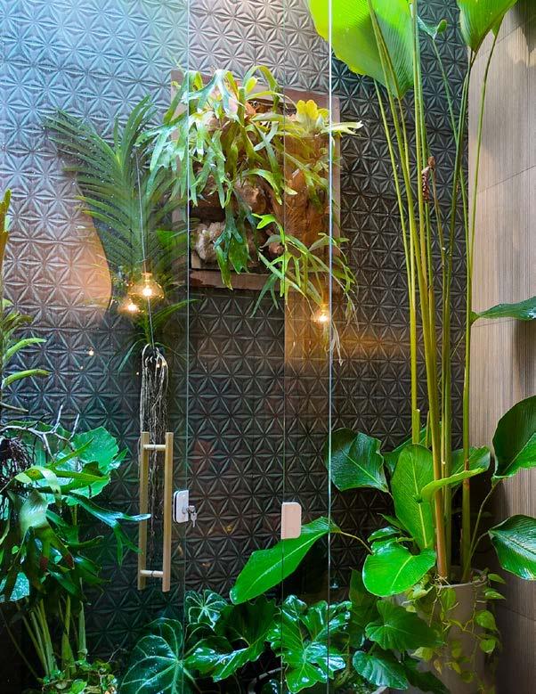 tes integrados e a criação de uma atmosfera de conforto como elementos principais do projeto. Conectados com a natureza, tinham como sonho primordial integrar o verde ao banheiro, convertendo-o em um espaço de refúgio e relaxamento.