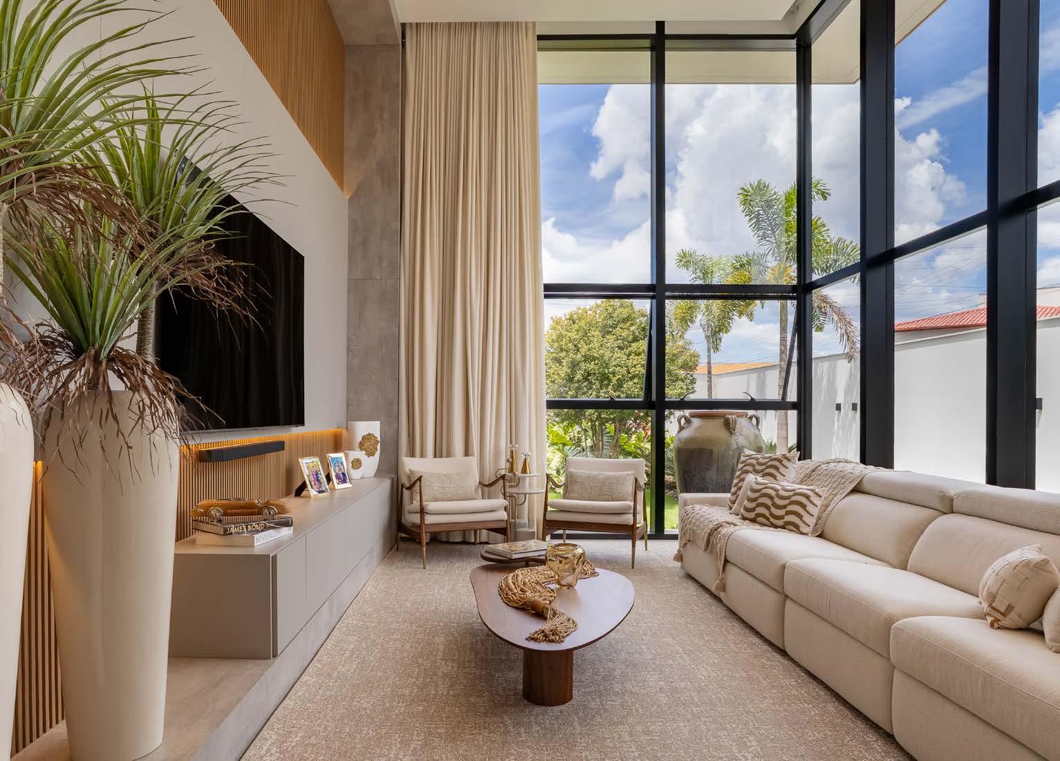 A partir do perfil dos moradores, a arquiteta definiu uma linguagem contemporânea com influência do estilo organic modern, equilibrando linhas limpas e materiais sofisticados com elementos naturais e sensoriais. A integração do jardim ao espaço interno, a escolha de uma paleta neutra e quente, o uso de texturas, como o painel ripado e a pedra natural, além da iluminação acolhedora e dos metais dourados, foram decisões tomadas para reforçar o conceito de modernidade com aconchego, para promover uma vivência leve e envolvente dentro do próprio lar.