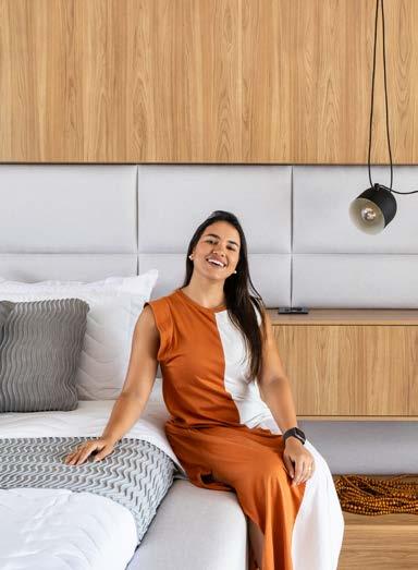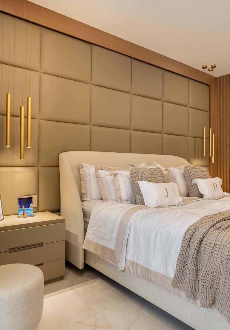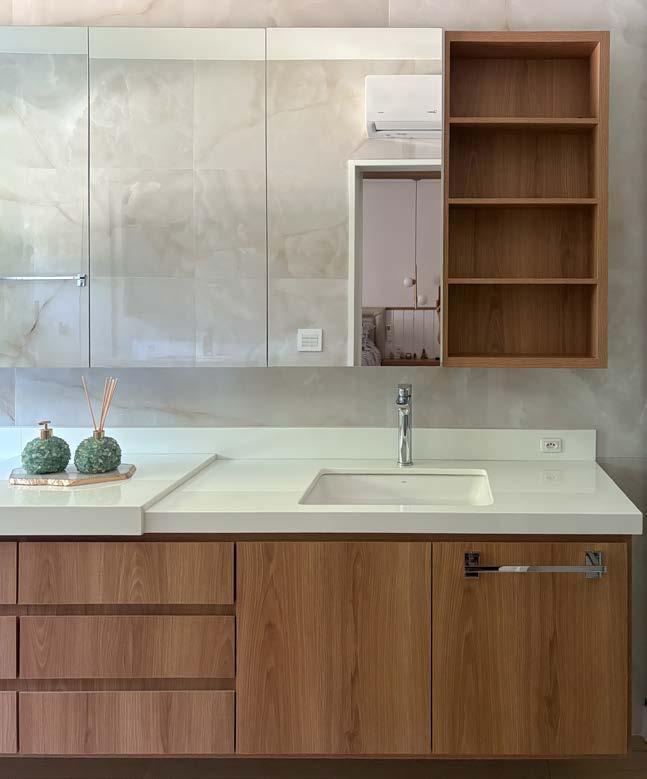 A marcenaria dialoga com essa linguagem, ao unir estética contemporânea e funcionalidade. Gaveteiros amplos e nichos abertos facilitam o uso cotidiano, organizando o ambiente sem interferir em sua harmonia e leveza.