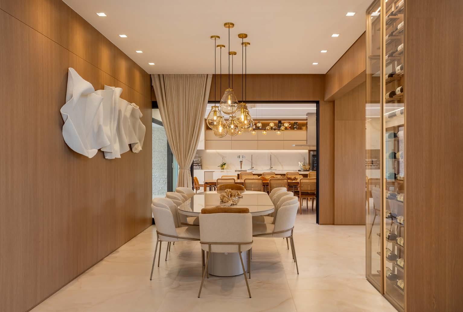 A adega iluminada é a protagonista do cenário da sala de jantar, que também está conjugada à cozinha. Com vários equipamentos modernos, a cozinha é prática, além de propiciar uma agradável vista para o jardim. A bancada em Nanoglass harmoniza com a charmosa cristaleira.