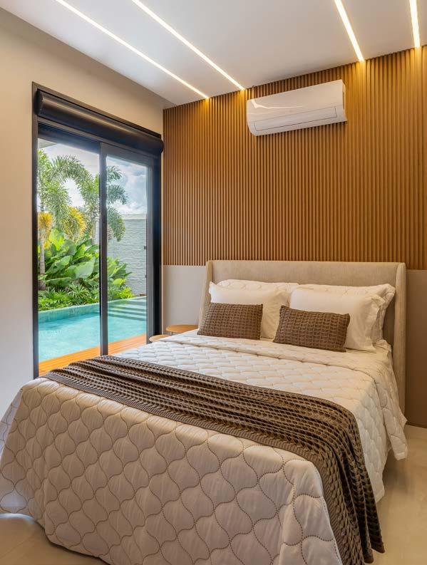 A residência tem mais dois quartos para hóspedes, sendo um deles com vista para a piscina. Em ambos avultam detalhes em MDF Carvalho Avelã, seguindo a mesma estética do quarto do casal. O escritório, por sua vez, apresenta o mesmo piso do restante da residência, o Galleria Onix Bianco, com detalhes em MDF Carvalho Avelã e Preto Absoluto.