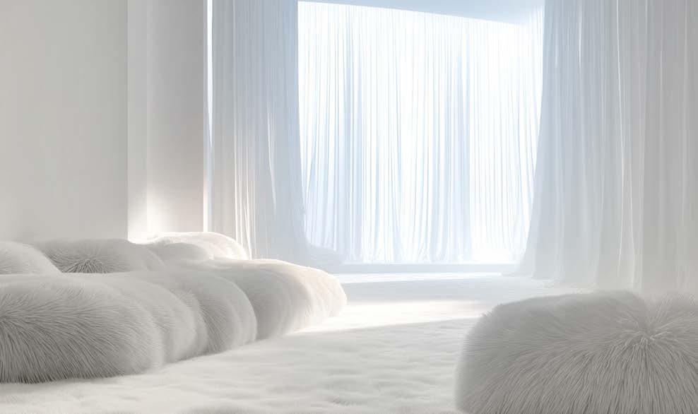 4201 Cloud Dancer é um tom de branco leve, que reflete a busca por equilíbrio entre o futuro digital e a necessidade primordial de conexão humana — um espaço liminar que funciona como uma plataforma de lançamento para a expressão criativa.”
