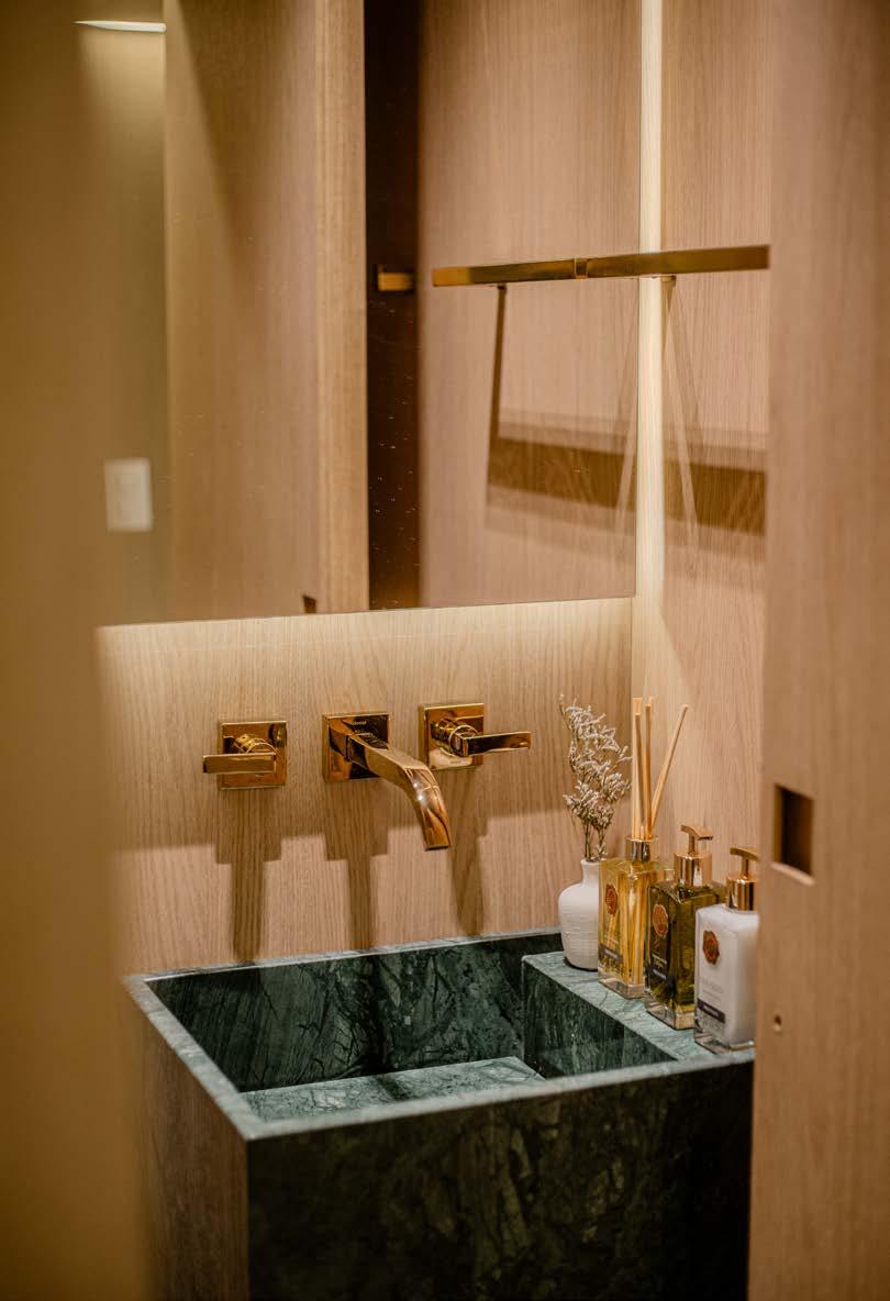 Este lavabo foi pensado para proporcionar uma experiência sensorial completa, por meio de um estilo contemporâneo, marcado por linhas limpas, materiais nobres e uma paleta equilibrada. Para sofisticar o projeto, foi utilizada uma cuba esculpida em mármore Verde Guatemala. Essa peça de forte presença estética e tonalidade marcante tornou-se uma das protagonistas do ambiente. A sofisticação foi realçada pela bica de parede Stillo em acabamento dourado. Já as paredes foram revestidas em MDF Carvalho Natural – Guararapes, uma releitura do carvalho americano, que trouxe aconchego e textura natural ao espaço. O revestimento das paredes contracena com o piso revestido em Onyx Uniq 120x120 cm. Para completar a composição, o toalheiro, a ducha higiênica e o porta-papel seguem a mesma linha Stillo em ouro polido, garantindo unidade estética e coerência visual. O som ambiente proporcionado pela instalação de caixas de som reforça a atmosfera acolhedora e transforma o lavabo em um espaço de bem-estar, e não apenas de passagem.