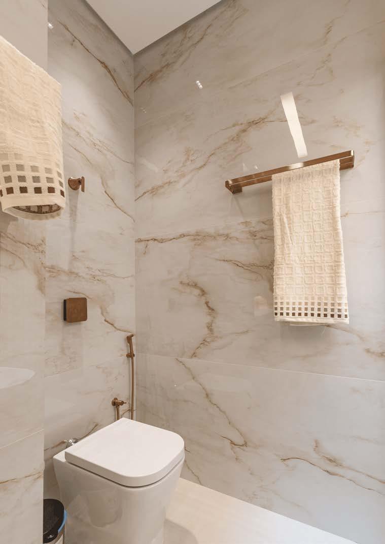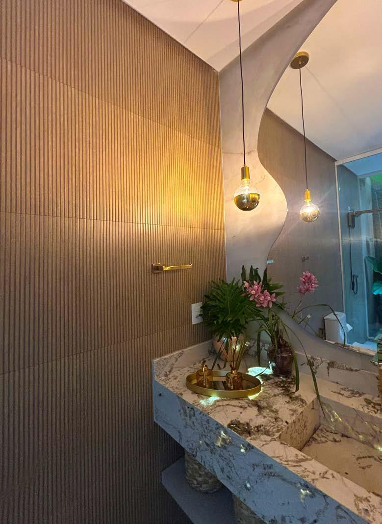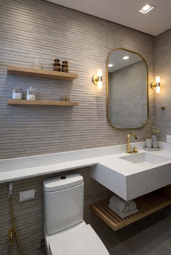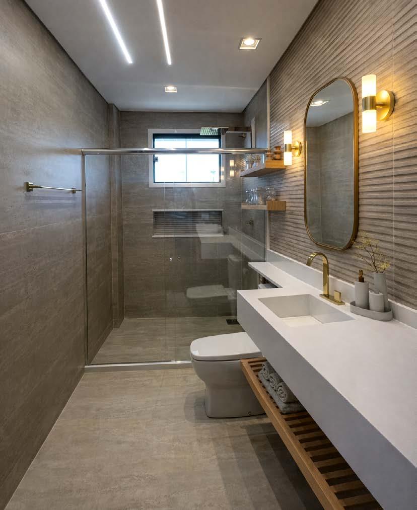 Este banheiro social foi projetado para uma família de alto-astral e apaixonada por receber. Por isso, a ideia foi transformar um espaço funcional em uma experiência de conforto e acolhimento. A base do projeto e as escolhas de materiais já revelam sua elegância atemporal. O porcelanato Retificado Mezzo Be Nat 120x120 cm, acetinado, envolve todo o ambiente em uma atmosfera de continuidade visual, enquanto o Mezzo Decor Nat 30x120 cm adiciona textura e profundidade à parede principal. O jogo entre luz e relevo cria movimento e sofisticação. Os metais em acabamento Gold da linha Polo – da torneira de mesa com bica alta ao acabamento de registro, da ducha higiênica à papeleira e ao porta-toalha – conferem personalidade e refinamento. Cada elemento foi escolhido para dialogar com a proposta contemporânea, trazendo brilho, mas sem excessos. A iluminação com a arandela Neal valoriza as texturas e aquece o ambiente, enquanto o toque amadeirado das prateleiras em MDF Naval Itapuã equilibra estética e funcionalidade com leveza e resistência, um detalhe que reforça a praticidade desejada pela família.