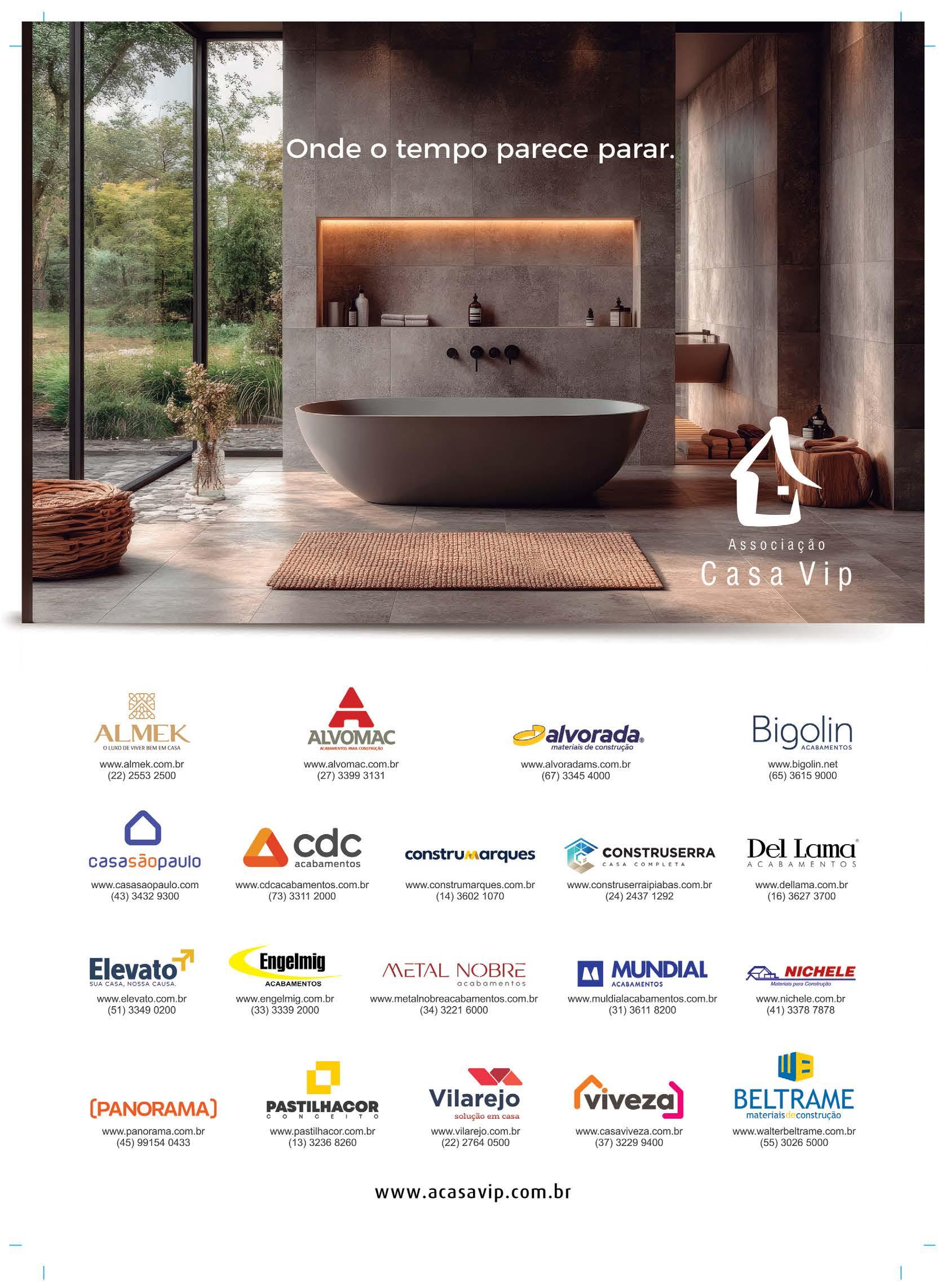 • Criação e Execução: Entrelinhas Conteúdo & Forma (51 99633.9612) • Editora: Milene Leal • Redação: Taciane Corrêa • Edição de Arte: Luciane Trindade • Impressão: Coan • Coordenação do Projeto Revista Casa Vip: Claudia Maria Chaves e Tulio Greco • Revista distribuída pelas empresas integrantes da Associação Casa Vip: Almek, Alvomac, Alvorada, Beltrame, Bigolin, Casa São Paulo, CDC, Construserra, Construmarques, Del Lama, Elevato, Engelmig, Metal Nobre, Mundial, Nichele, Panorama, Pastilhacor, Vilarejo e Viveza • Tiragem: 35 mil exemplares • A reprodução total ou parcial do conteúdo desta obra é expressamente proibida sem prévia autorização da fonte. A Revista Casa Vip é uma publicação das revendas de materiais para construção associadas à Rede Casa Vip • www.acasavip.com.br