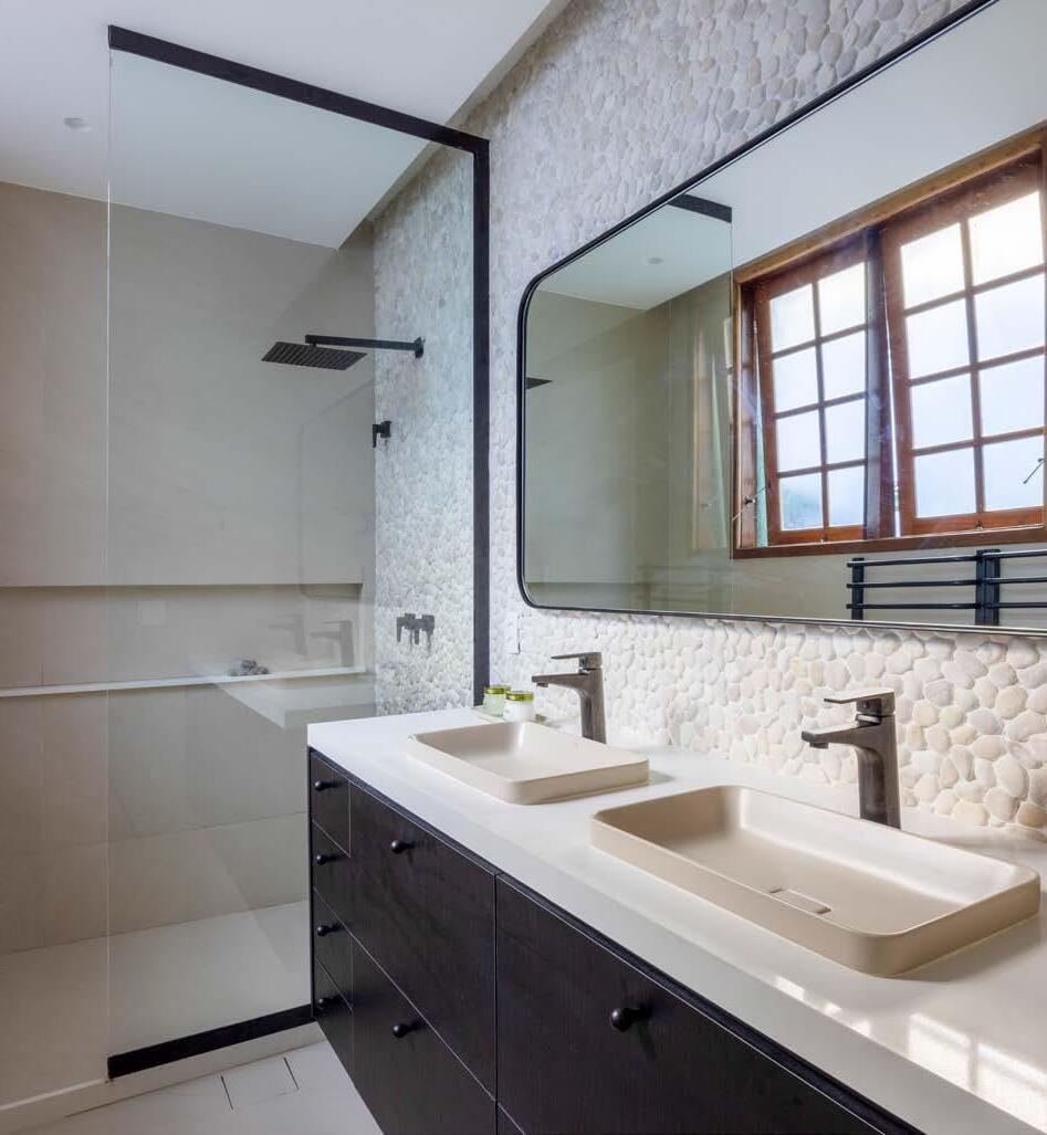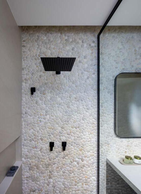 Este banheiro integra o segundo pavimento de uma casa ampla que passou por uma reforma completa, com atualização de acabamentos e, principalmente, uma planta redesenhada para atender melhor à rotina da família. Trata-se do banheiro máster do casal, pais de duas crianças pequenas, e por isso ele precisava equilibrar conforto, praticidade e uma sensação real de “respiro” para o dia a dia. O projeto foi pensado para facilitar a rotina de ambos, com duas cubas, bancada ampla, circulação generosa e uma atmosfera tranquila. Para construir esse clima, elementos naturais foram incorporados à composição. O seixo orgânico Mosaico 30x30 cm adiciona textura sensorial e ajuda a deixar o espaço mais acolhedor. Já no piso e no restante das paredes aplicou-se o porcelanato Boulevard Beige 119x 119 cm. Como contraste, detalhes em preto matte e ônix pontuam o ambiente, imprimindo um toque contemporâneo e sofisticado ao projeto decorativo. O resultado é um banheiro equilibrado, com leveza de linguagem, onde o natural e o moderno convivem com simplicidade.