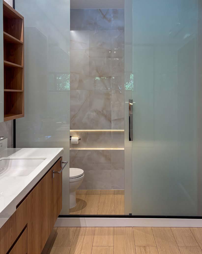 O revestimento usado nas paredes, Onix Bianco Lux 60x120 cm, com veios suaves e tonalidade neutra, estabelece uma base clara, conferindo sofisticação discreta ao conjunto. No piso, o porcelanato amadeirado Cumaru Bege 20x120 cm introduz calor e textura, criando um