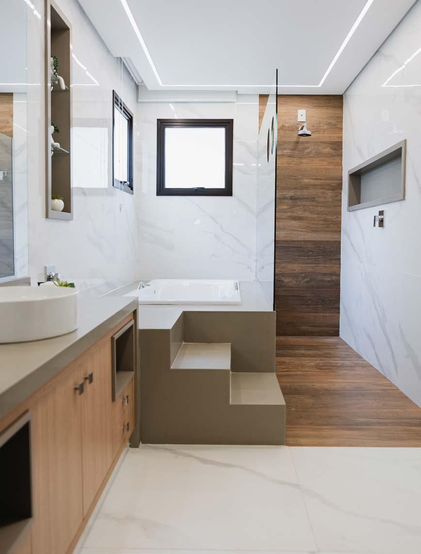 Os dois nichos são horizontais, um na parede da banheira e outro na parede que percorre toda a extensão do box, para organizar os produtos de uso cotidiano sem a necessidade de suportes externos. Eles também foram revestidos com o mesmo porcelanato Monte Bianco e retroiluminados com fita de LED, buscando uma iluminação indireta e relaxante.