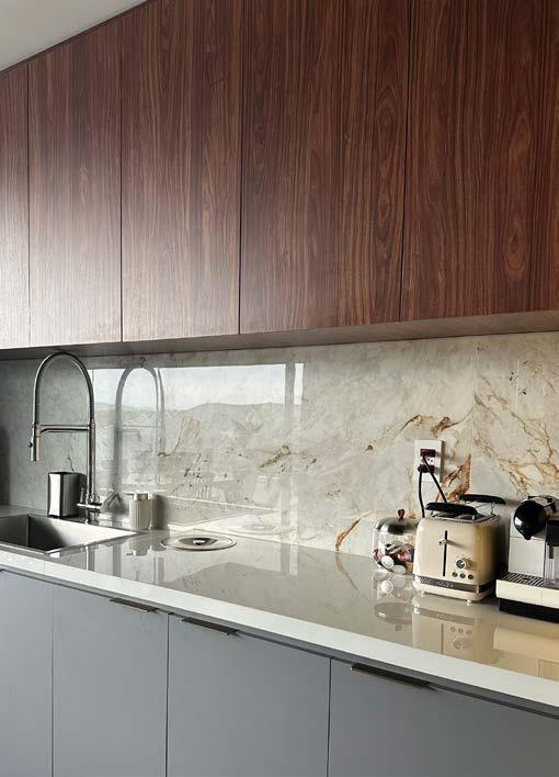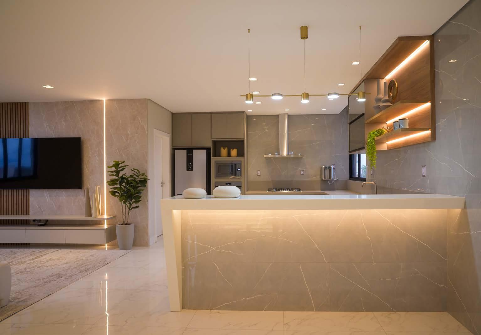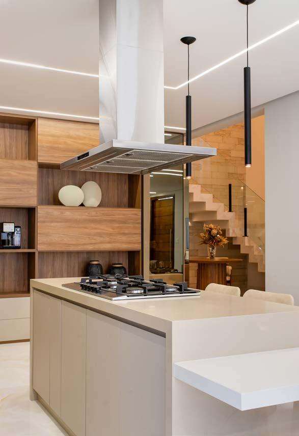 a alta, em Silestone Branco, foi projetada para refeições rápidas e momentos descontraídos, enquanto a parte funcional da cozinha recebeu o prático Silestone Cinza. Na marcenaria da sala foram usados os mesmos tons da cozinha (Noce Naturale e Nude Vel) e o painel da TV tem MDF Amana com perfil de LED. A parede foi revestida com o Savoy Silver Polido 80x140 cm, que gera imponência e sofisticação, mas sem excessos. A iluminação foi essencial para evidenciar cada detalhe da marcenaria, das texturas e dos materiais, enquanto a escada trabalhada em Silestone permite o acesso à área gourmet, tornando-se mais um ponto de destaque na casa.