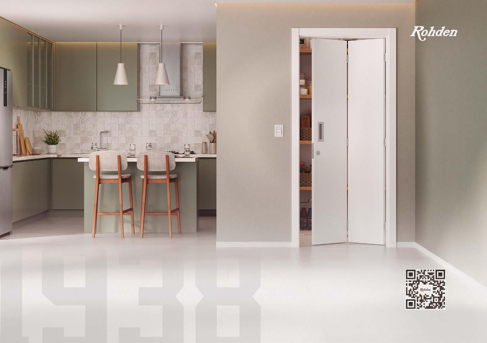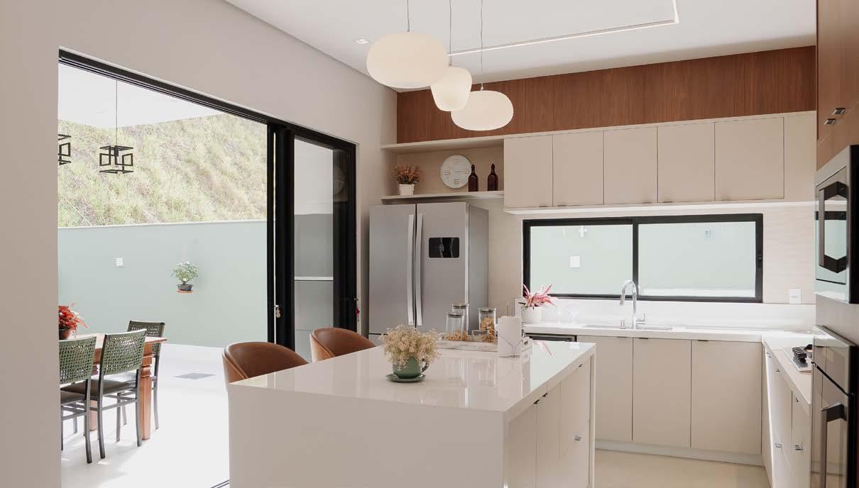 A ampla janela garante ventilação natural e abundante luminosidade, valorizando a vista e tornando o ambiente ainda mais agradável para o uso diário. O porcelanato Solene WH 120x120 cm, o mesmo utilizado na área social, reforça a sensação de integração e continuidade visual entre os espaços, já que foi aplicado no piso e nas paredes. Desse projeto resultou uma cozinha interligada à área de jantar, com luz suave, cores neutras e detalhes que convidam a viver momentos especiais.