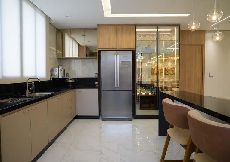 especial fica por conta do armário envidraçado com iluminação interna, ideal para expor o acervo de louças da cliente de forma elegante e organizada.