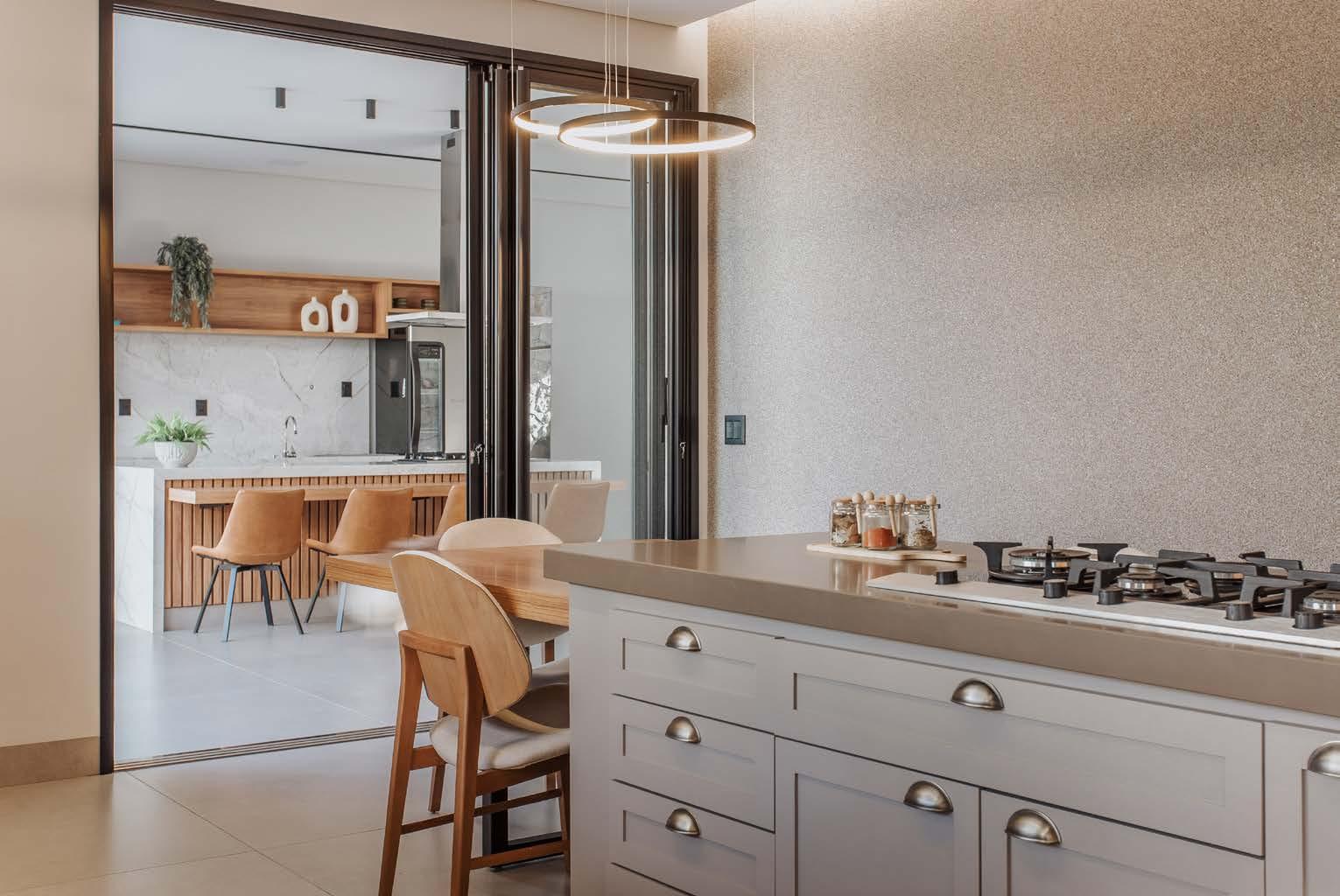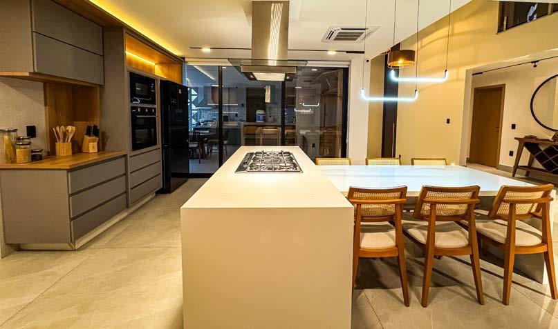 Nas paredes, o destaque coube ao Porcelanato Retificado Oasi Duna Ripa Mate 45x120 cm, aplicado de forma a reforçar a sensação de continuidade e amplitude. Esse revestimento incorporou sutileza e sofisticação à ambientação, complementando as superfícies pintadas da área gourmet. As bancadas são de Super Nano e na parte inferior da ilha central utilizou-se o mesmo Oasi Duna Ripa Matte. O resultado final é um espaço contemporâneo, acolhedor e funcional. Uma cozinha integrada que reflete o estilo de vida dos moradores e a atenção aos detalhes em cada escolha.