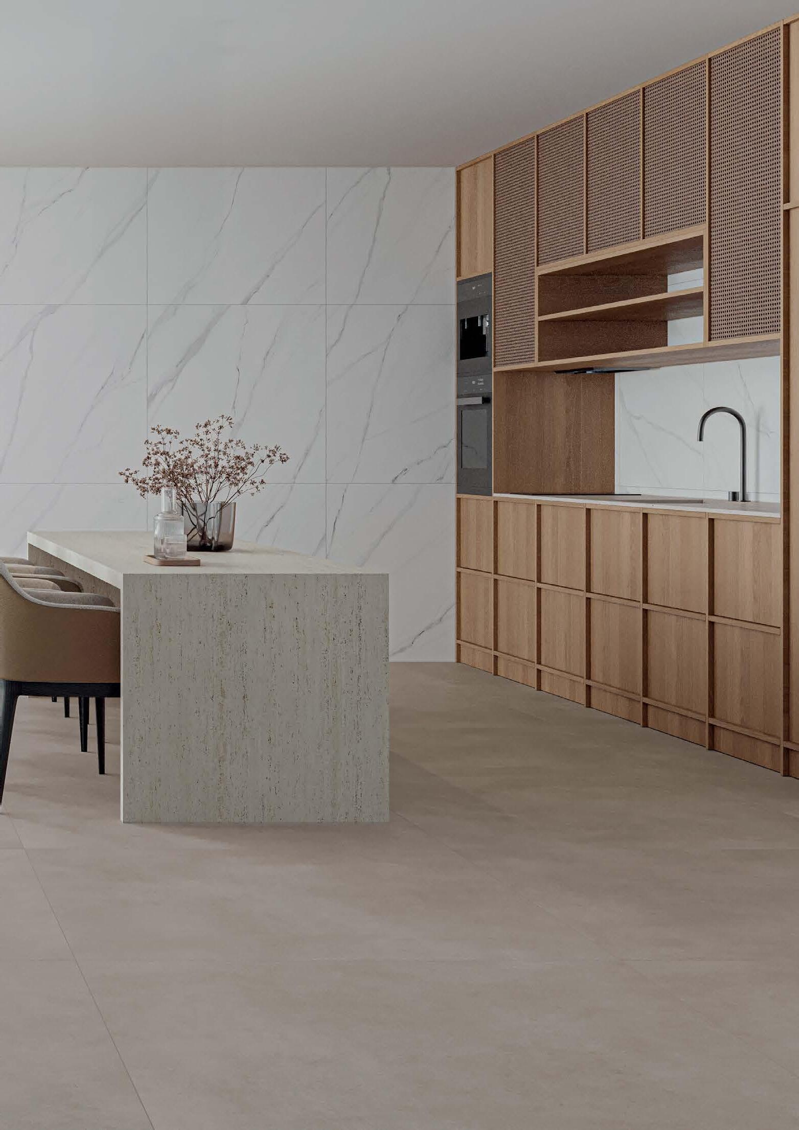 A fluidez é um dos objetivos do projeto, que estabelece um elo harmonioso entre a cozinha e a área de jantar, onde a base neutra do piso se une à textura natural do ripado presente na ilha em mármore branco Athena polido. O equilíbrio proposto foi alcançado a partir desse contraste entre a calidez da madeira e a sobriedade do piso cimentício. O resultado é uma cozinha integrada com o ambiente social que celebra a culinária e o convívio por meio de uma estética sofisticada.