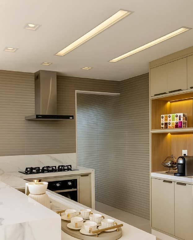 A iluminação linear embutida percorre a cozinha com sutileza, reforçando as linhas precisas do projeto e valorizando cada superfície do ambiente.
