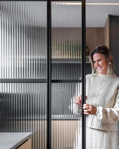 As bancadas são todas do mesmo quartzito Wakanda. As portas em perfil preto com vidro canelado e os nichos com iluminação embutida propiciam transparência e leveza, conferindo um toque contemporâneo. A iluminação valoriza cada detalhe: as prateleiras com pontos de luz embutidos realçam os objetos e o verde das plantas; já a iluminação linear sob os armários amplia a percepção de profundidade e cria uma atmosfera acolhedora.