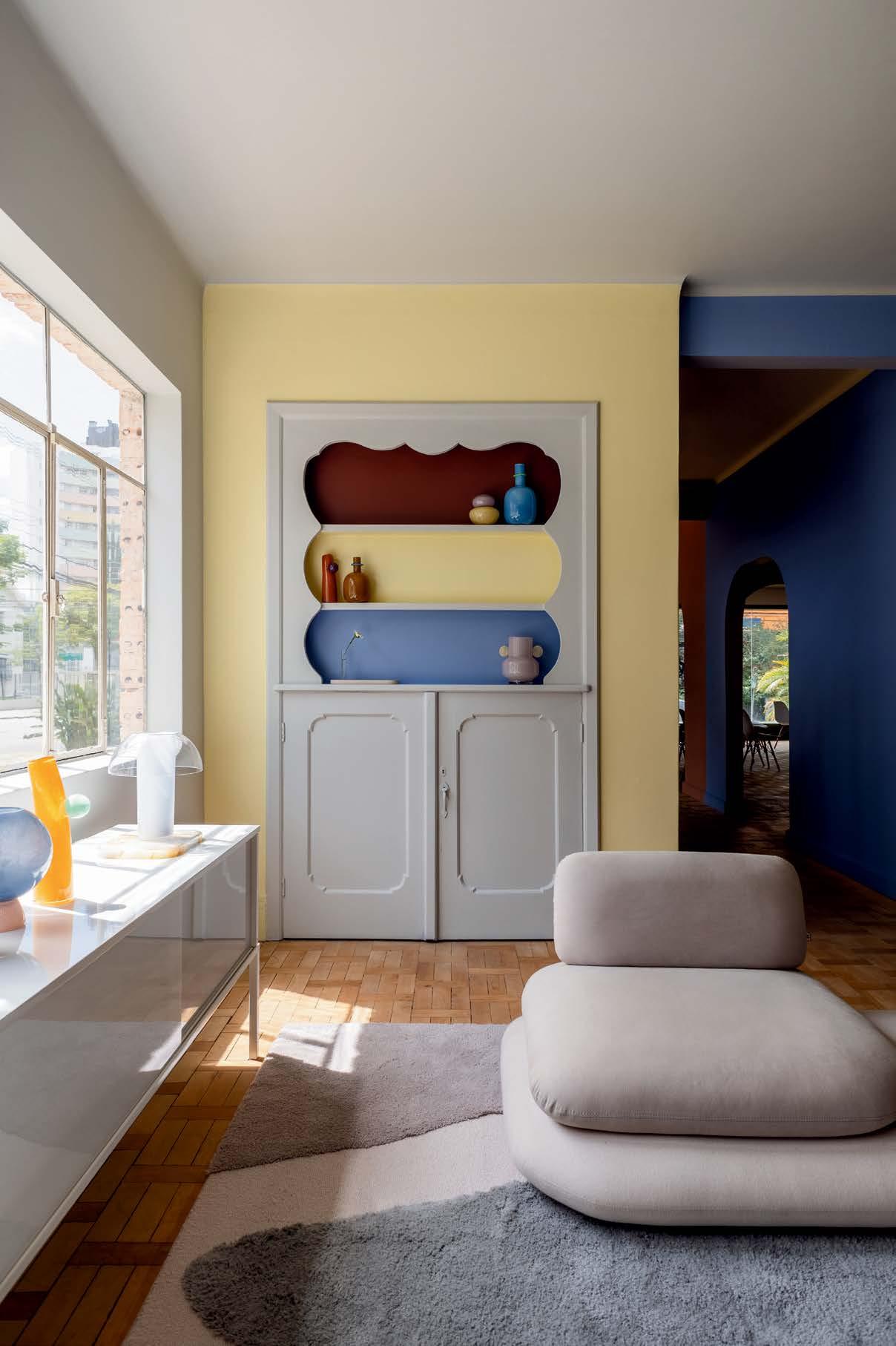 toque de suavidade. Uma das principais alterações na área social foi a escada, agora revestida em Carvalho natural, que originalmente ocupava o centro da sala. Sua realocação possibilitou uma circulação mais dinâmica e liberou espaço para integrar a varanda ao ambiente principal.