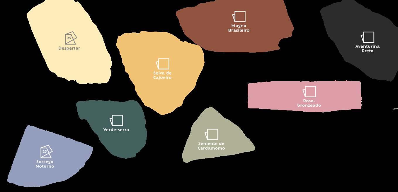 Mescla tons provindos da reciclagem. Enquanto uma dupla de verdes empoeirados evoca o vidro e o plástico jogados fora, um preto absoluto homenageia os trabalhos feitos com carbonização. Em contraponto, surgem nuances: um rosa-brilhante, um azul-avioletado, um amarelo-luminoso, um marrom-amadeirado e um ocre-mediano, remetendo à energia biodegradável.