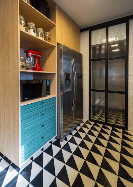 armário e a mesa em madeira de demolição foram o ponto de partida deste projeto. A cliente também queria que predominasse a cor azul e que os eletrodomésticos de uso rotineiro ficassem à disposição. Com esses dados, criou-se uma cozinha que equilibra a rusticidade – presente nos móveis de madeira de demolição – e a contemporaneidade do perfil do casal, expressa pelas portas com molduras e a tonalidade azul na marcenaria. Para equilibrar a paleta, foram usados pisos e paredes em bege, complementados pelo quartzo branco na bancada, criando uma base neutra que destaca os elementos essenciais. Um grande nicho foi planejado para abrigar os eletrodomésticos, facilitando o acesso.