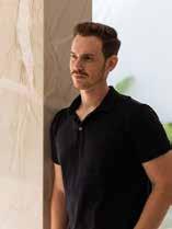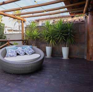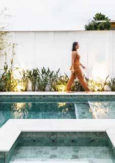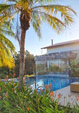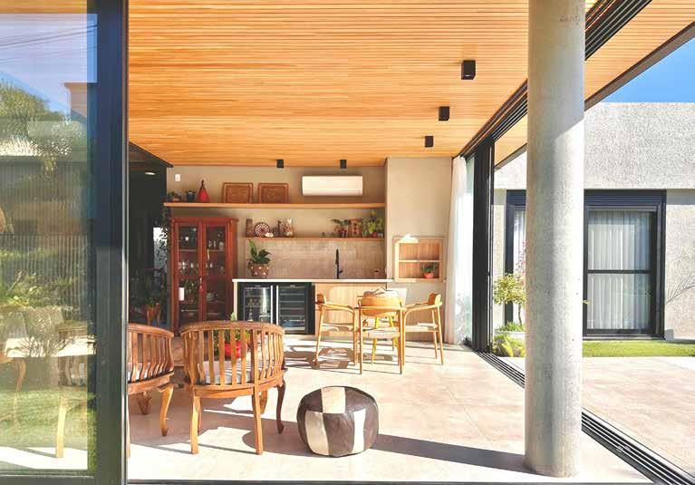 queimado. Já a divisória, revestida com ladrilho hidráulico Savona 60x60 cm, vai além da separação visual. Posicionada atrás da bancada e do forno de pizza, ela também atua como plano de fundo decorativo. Os ladrilhos hidráulicos, com padrões geométricos e florais em tons neutros, conversam com a rusticidade da madeira, o concreto da bancada e a estrutura de tijolos e telhas. Na varanda foi usada uma paleta de cores quentes e orgânicas. A cor marrom queimado do revestimento Iron 60x120 cm se aproxima do Aço Corten e harmoniza com o piso escuro em Madeira Slot Castanheira 20x100 cm, que reproduz a textura e a aparência da madeira natural. No coração do projeto, o lago artificial se destaca como ponto de contemplação e conexão com o entorno. Ele atua como espelho d’água que reflete a paisagem e a arquitetura, reforçando a harmonia entre o natural e o construído. Em seu entorno, os espaços convidam à permanência e ao descanso.