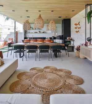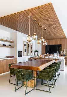 O forro em madeira ripada percorre o teto, aquecendo visualmente o ambiente e conferindo uma harmonia decorativa. Já a imponente mesa com tampo orgânico funciona como uma espécie de convite ao congraçamento, pois as cadeiras em trama verde reforçam a ideia de conexão com a natureza. No piso da área gour-