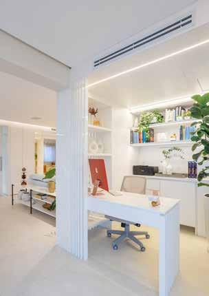 O projeto foi criado com uma proposta minimalista e predominância de tons claros, que proporcionaram leveza. A integração dos ambientes é outro destaque. A sala foi estruturada para atender a momentos de lazer e outros diferentes usos no dia a dia. No espaço da varanda foi criado o cantinho especial do home office, um pedido da cliente para fugir do tradicional escritório fechado e se conectar mais com o ambiente ao redor. O home office está separado da sala apenas pelos painéis em Laca Brilho branca, com efeito vazado. Um painel espelhado organiza sutilmente os acessos do apartamento e do lavabo. Este, em contraste com a base neutra da casa, tem cuba esculpida em mármore com tons quentes.