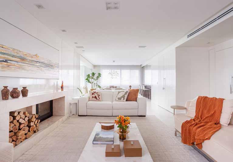 Para estabelecer um vínculo visual entre a varanda, a sala de estar e a cozinha, foi usado no piso o Shop Onyx Unique 90x90 cm. A mesa de jantar com oito lugares, em Quartzito Savana Escovado, reforça os tons claros e as linhas retas. É o mesmo revestimento utilizado na lareira, criando uma unidade decorativa. Um painel espelhado de embutir permite a conexão ou o isolamento da cozinha, de forma funcional e elegante. Na bancada, a Pedra Marrom Absoluto gera um contraste com o restante da área social, com a marcenaria branca e também com o revestimento da parede, o Shop Onyx Unique 120x120 cm.