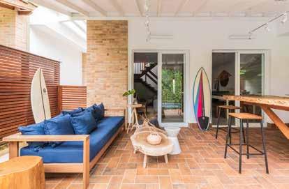 O projeto previa intervenções moderadas na aconchegante casa de um condomínio compacto no litoral norte de São Paulo. Com orçamento enxuto, já que a casa é destinada à locação, foram usados recursos práticos para reorganizar os espaços, tornando-os funcionais e bonitos. No pavimento inferior, a cozinha integrada à sala conecta-se também à área de lazer, criando um layout criativo e aconchegante. A área gourmet externa foi repaginada em busca de mais conforto e dinamicidade. Uma tora de madeira rústica foi usada como bistrô, apoiada na bancada de pedra em granito Itaúna, com visual de pedra bruta. Para o piso foi selecionado o porcelanato Pietra Cotta, 15x30 cm, e na parede molhada foram usadas réguas de cimentício Apparente de diferentes tamanhos: 75x8 cm e 120x12 cm.