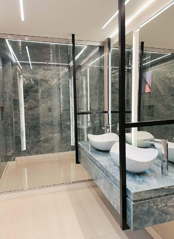 A proposta desta suíte, planejada para o motel Jardin d’Amour, no Rio de Janeiro, é proporcionar um espaço ousado, exótico e refinado, que rompe com os clichês decorativos e oferece uma nova leitura de sensualidade e sofisticação. Para isso, foram escolhidos dois revestimentos, que se complementam com equilíbrio e impacto. O marmorizado Blue Moon 805x140 cm, com sua padronagem marcante e tom profundo, propicia um toque exótico e luxuoso ao box e à bancada esculpida, projetada para receber as cubas Ruy Ohtake. Os metais cromados adicionam sofisticação e brilho na medida certa, enquanto o espelho retroiluminado e o vidro translúcido complementam a atmosfera com leveza, fluidez e elegância. O porcelanato Copan Off White 108x108 cm, aplicado na parede e no piso, faz um contraponto neutro, conferindo harmonia à composição. A atmosfera sensorial foi cuidadosamente concebida: o box com dois chuveiros de teto e nichos verticais iluminados cria uma cena envolvente, onde a luz não apenas valoriza a nobreza dos materiais, mas também realça sutilmente a presença dos corpos, sugerindo proximidade, desejo e conexão, mas sempre de forma delicada. O resultado é um banheiro voltado para despertar todos os sentidos, com visual marcante e ousado, sem abrir mão da plena funcionalidade.